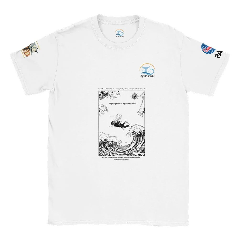 T shirt Prints🌊 "From birth, man carries the weight of gravity on his shoulders... But man has only to sink beneath the surface and he is free." – Jacques Cousteau